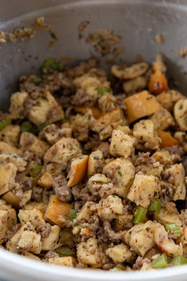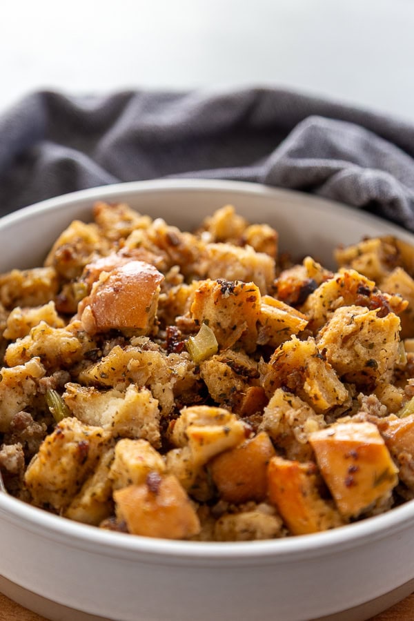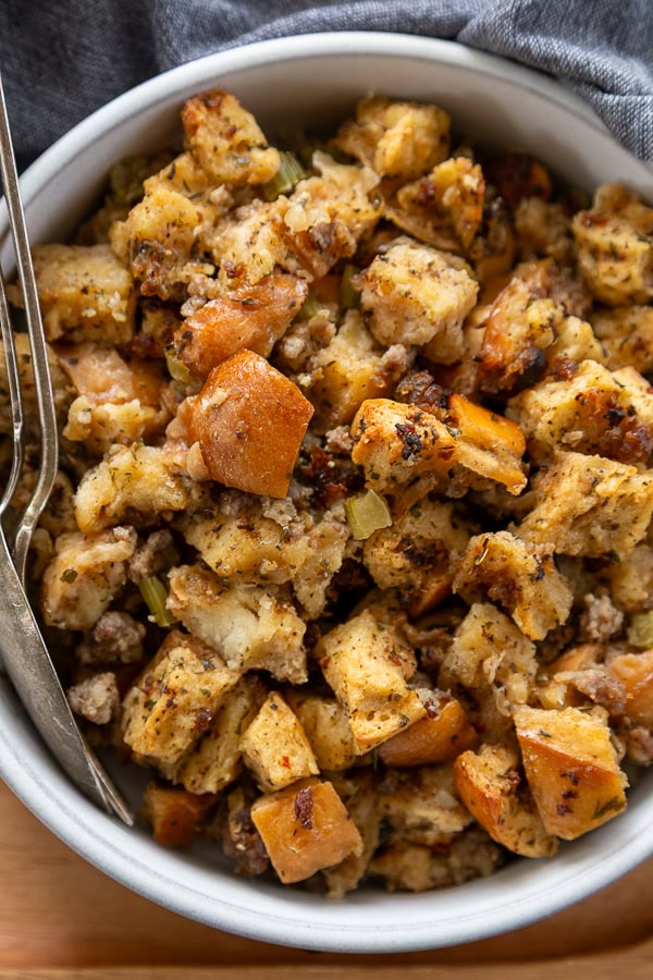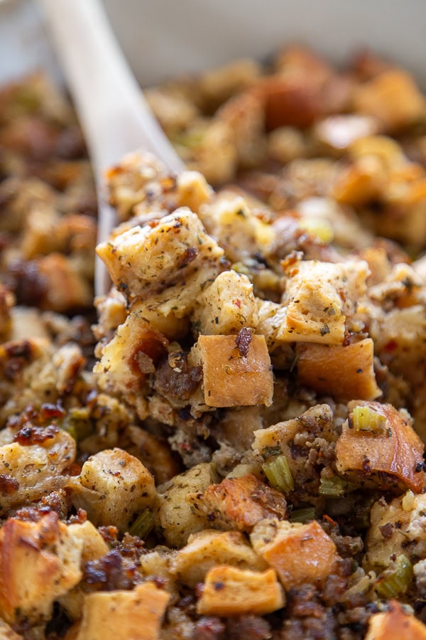 I seriously love this recipe, and I am not even a big stuffing fan. The Italian sausage, celery, onion, and seasonings make this a classic. The Italian bread (you could use the French bread too) takes it over the top. I love the big chunks of bread.