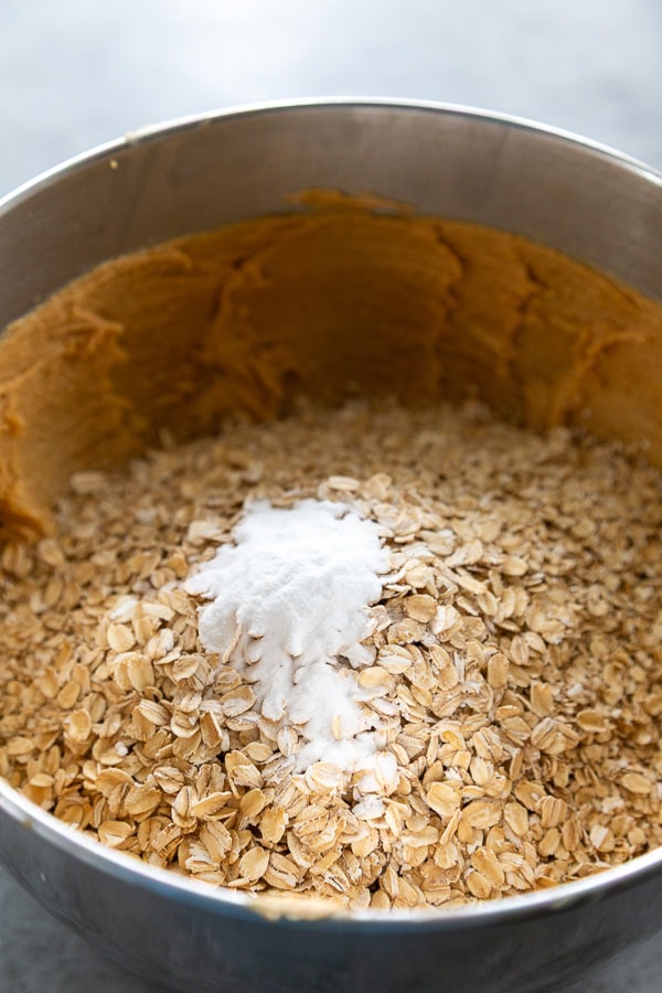 - Add quick oats, rolled oats and baking soda and mix until combined. Stir in the butterscotch chips.