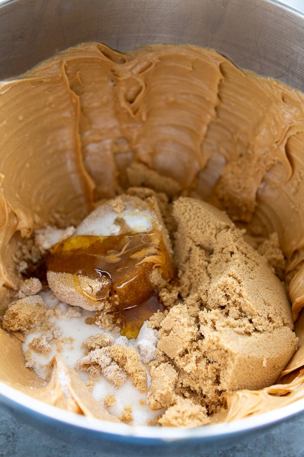 In a large mixing bowl beat together butter and peanut butter until well combined. Add brown sugar, granulated sugar, honey and vanilla and beat until smooth.