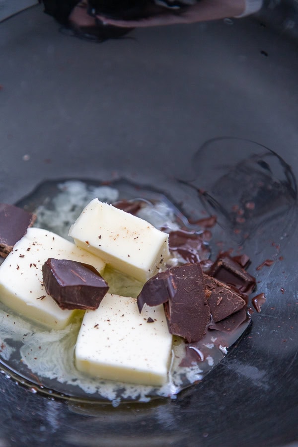 - Heat butter and chocolate over low heat, stirring constantly until chocolate is melted; cool slightly.