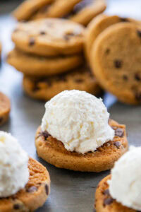 - Grab 2 of the chocolate chip cookies. Using an ice cream or cookie dough scooper or tablespoon, scoop some of the cream cheese filling onto one of the chocolate chip cookies.