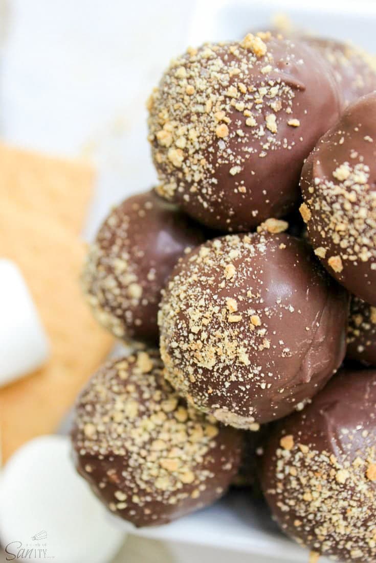 - Once the chocolate has hardened, dip the top 1/2 in the chocolate, gently shaking off extra, then immediately place wet chocolate side up, and sprinkle with additional graham cracker crumbs. Repeat with remaining bites.