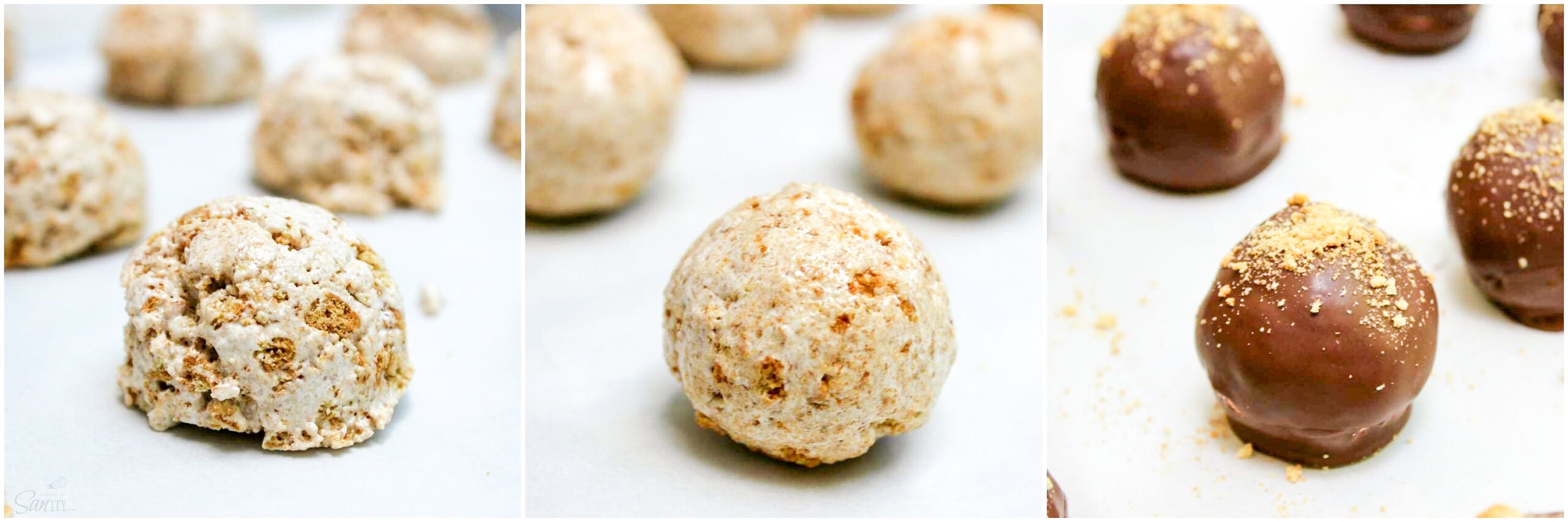 These were delicious! A couple of tips that worked for me … 1st, I crushed the graham crackers in the food processor and then added the melted butter and fluff right into the food processor. It worked great and the dough was not at all sticky. 2nd, I refrigerated the balls until they were firm and then rolled the whole thing in the melted chocolate (not half and then the other half) – much quicker this way.