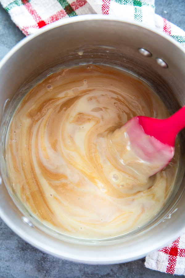 - In a medium saucepan heat sweetened condensed milk and peanut butter over medium heat until just bubbly, about 7-9 minutes, making sure to stir constantly. The milk and peanut butter will start to thin and bit and bubble; that is how you know it is done.